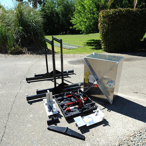 This set has an Aluminum tank (65 lbs. ) which is about 45 lbs. lighter than the steel set which makes it easier to maneuver during the test. The stands and crane are still made out of steel. The picture shows